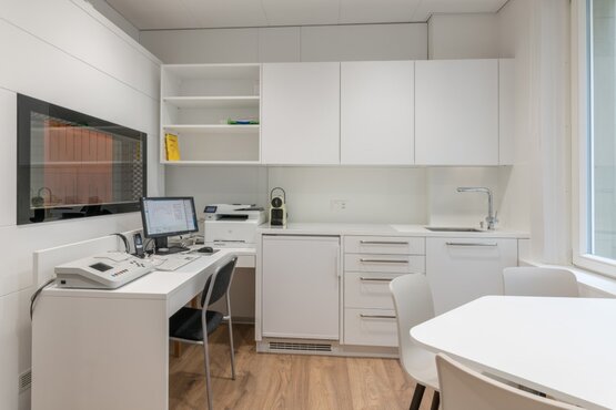 Ich entschied mich als Proband bei den Ärzten untersuchen zu lassen, um die Abläufe besser zu verstehen. Diese Massnahme führte zur Erkenntnis das ihre "heilige" Hörkabine absolut nichts Wert war und ich die Ärzte davon überzeugen konnte diese uralten Vehikel zu entsorgen und das wir uns eine neue Hörkabine organisieren. So konnte endlich einen sehr guten Workflow generiert werden und die Patienten sind nun ebenerdig im Warten zu Hause. Die Hörkabine kombinierte ich mit dem Personalaufenthaltsraum. Mit all diesen Massnahmen konnte ich inzwischen eine gute Lösung dem Ärzteteam anbieten. Heute sind beide Ärzte äusserst zufrieden mit ihrer neugestalteten Praxis.