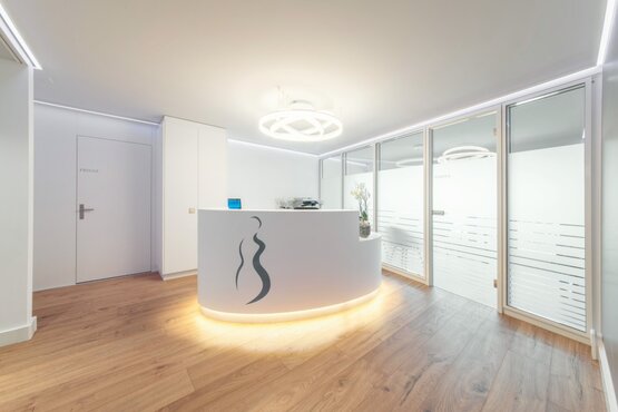 Als wir das Projekt übernahmen, erarbeiteten wir umgehend eine Gesamtplanung mit Elektro- und Sanitärplanung und gaben das Baugesuch ein. Anschliessend setzen wir uns mit der Gestaltung auseinander und kreierten den geschwungenen Empfang als Symbol für die schwangere Frau. Im Weiteren konnten wir Frau Sahili mit unserem Grundriss überzeugen, indem die Glastrennwand vom Empfang zum Warten schräg gestellt ist. Wir kreierten ein Moodboard und erste Visualisierungen, um damit unsere Gestaltungsideen zu präsentieren. Daneben führten wir mit dem Vermieter Verhandlungen für die Kostenübernahmen, die er zugesichert hatte.